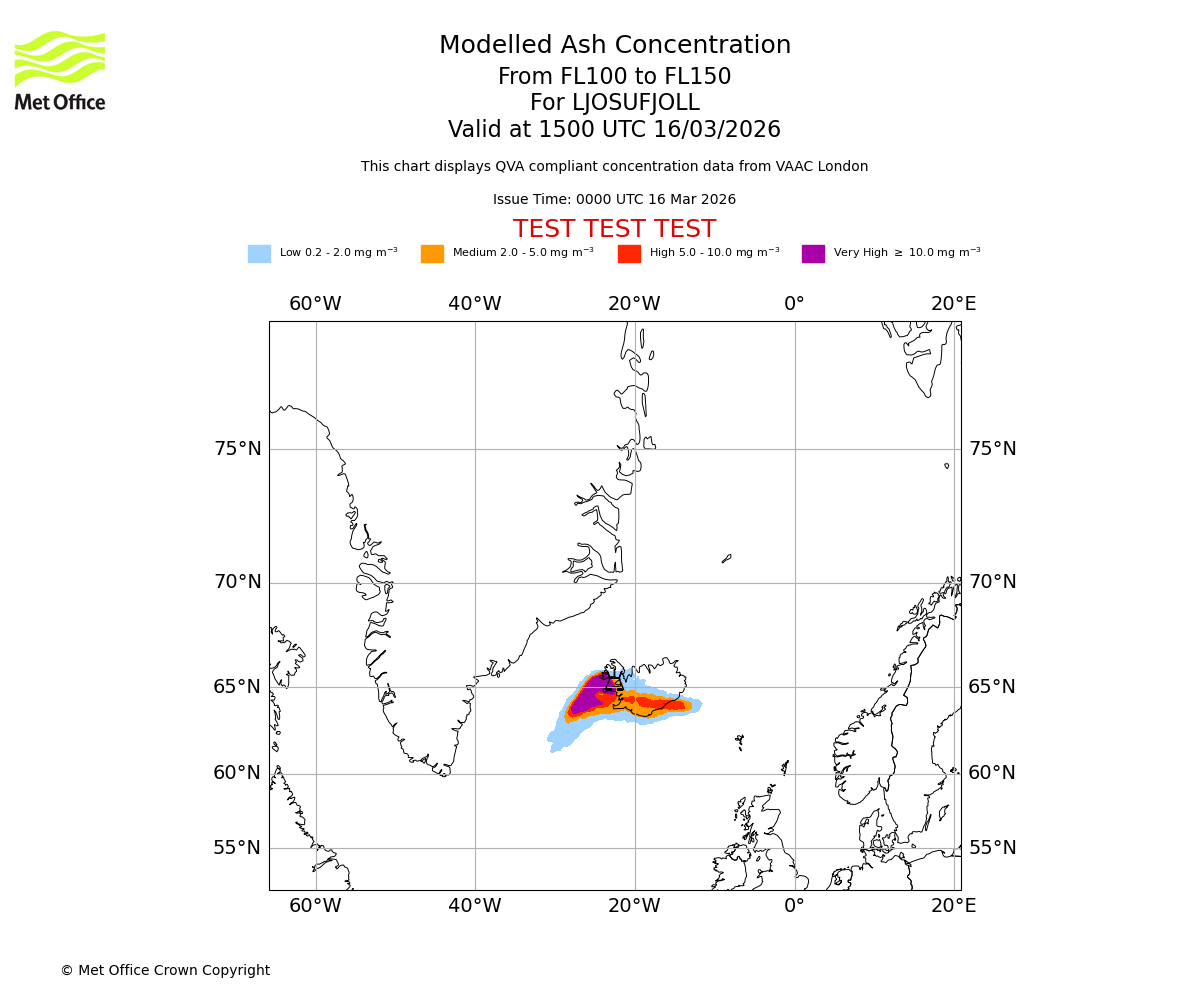 Modelled ash concentration from 050 to 100 for LJOSUFJOLL. Valid at 1500 UTC 16/03/2026