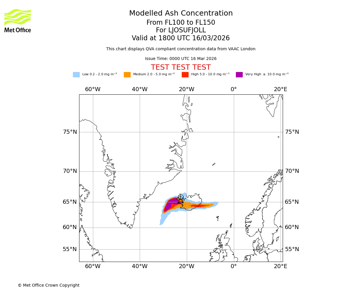 Modelled ash concentration from 050 to 100 for LJOSUFJOLL. Valid at 1800 UTC 16/03/2026