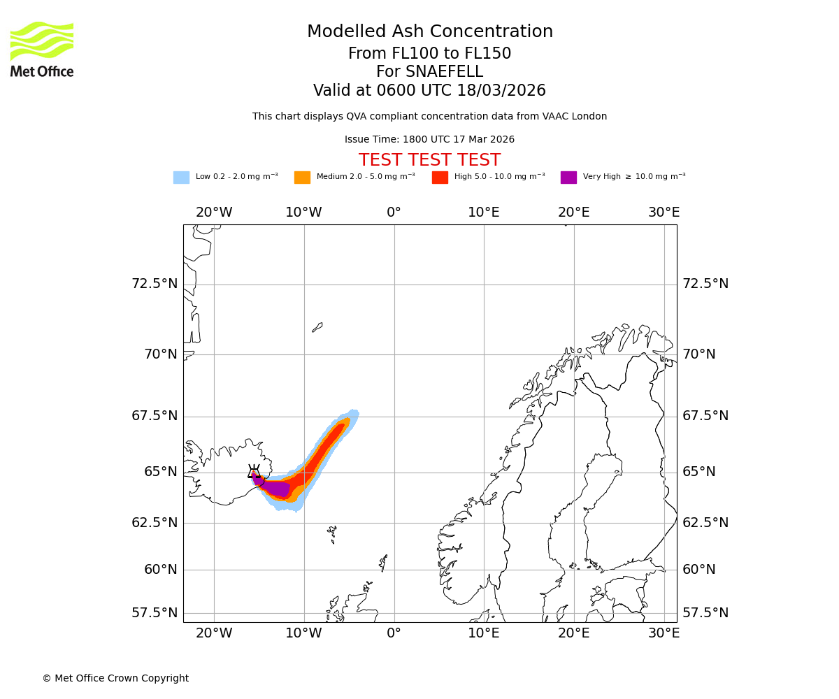Modelled ash concentration from 050 to 100 for SNAEFELL. Valid at 0600 UTC 18/03/2026