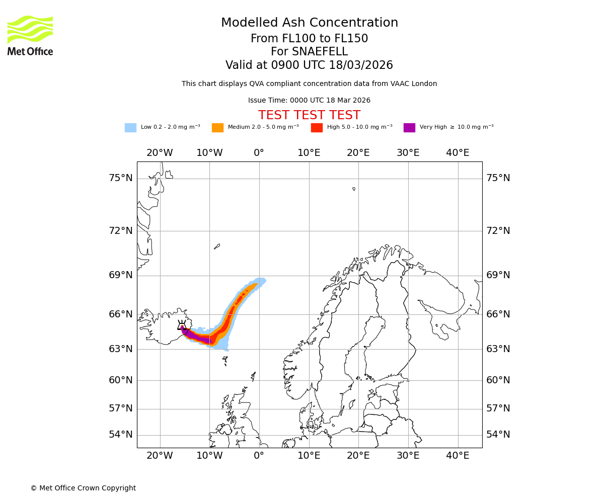 Modelled ash concentration from 050 to 100 for SNAEFELL. Valid at 0900 UTC 18/03/2026