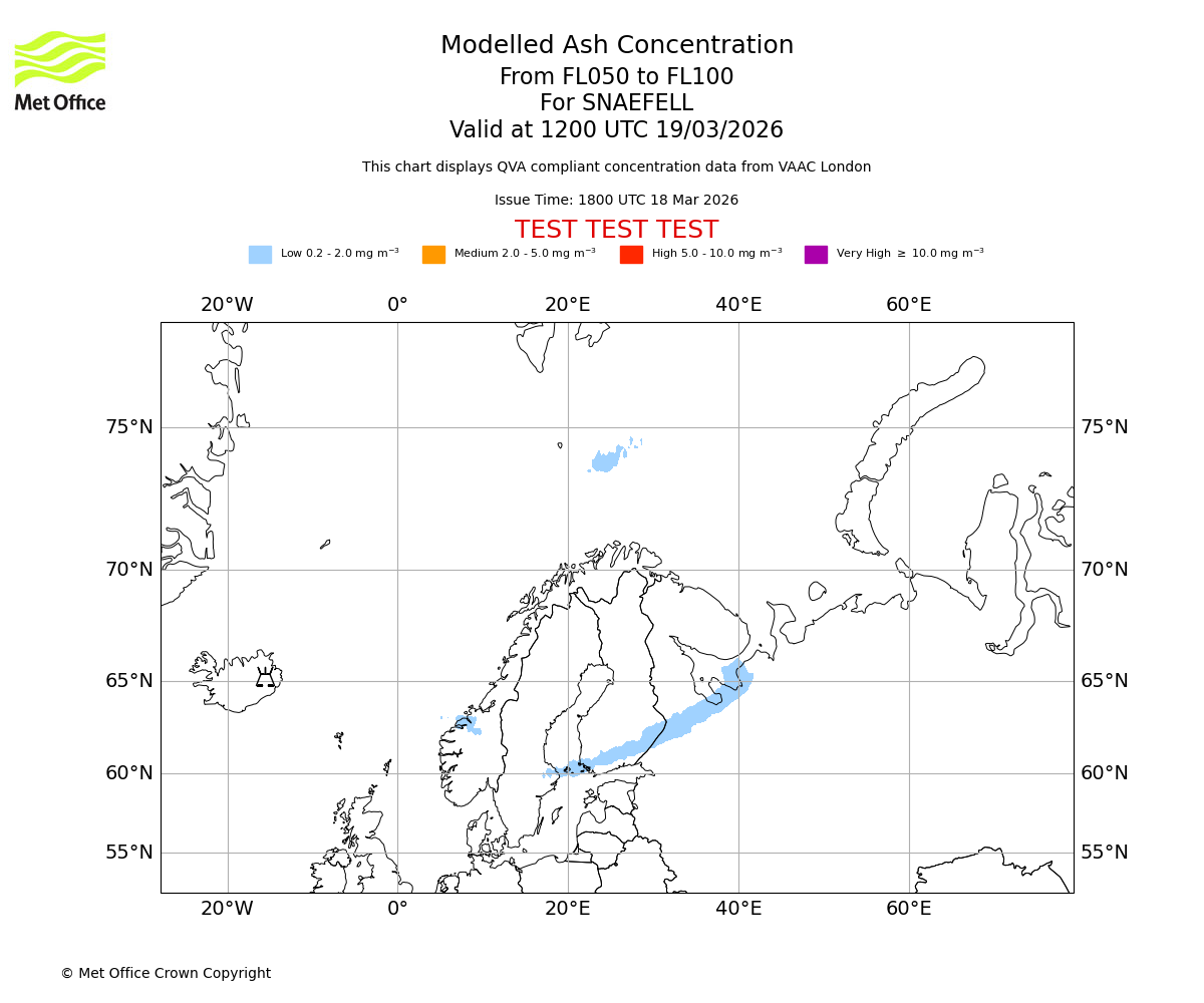 Modelled ash concentration from 000 to 200 for SNAEFELL. Valid at 1800 UTC 18/03/2026