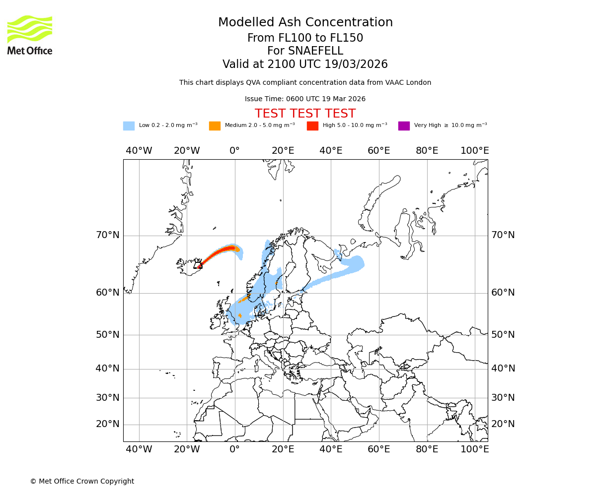 Modelled ash concentration from 050 to 100 for SNAEFELL. Valid at 2100 UTC 19/03/2026