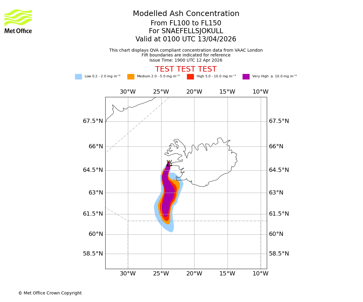 Modelled ash concentration from 050 to 100 for SNAEFELLSJOKULL. Valid at 0100 UTC 13/04/2026