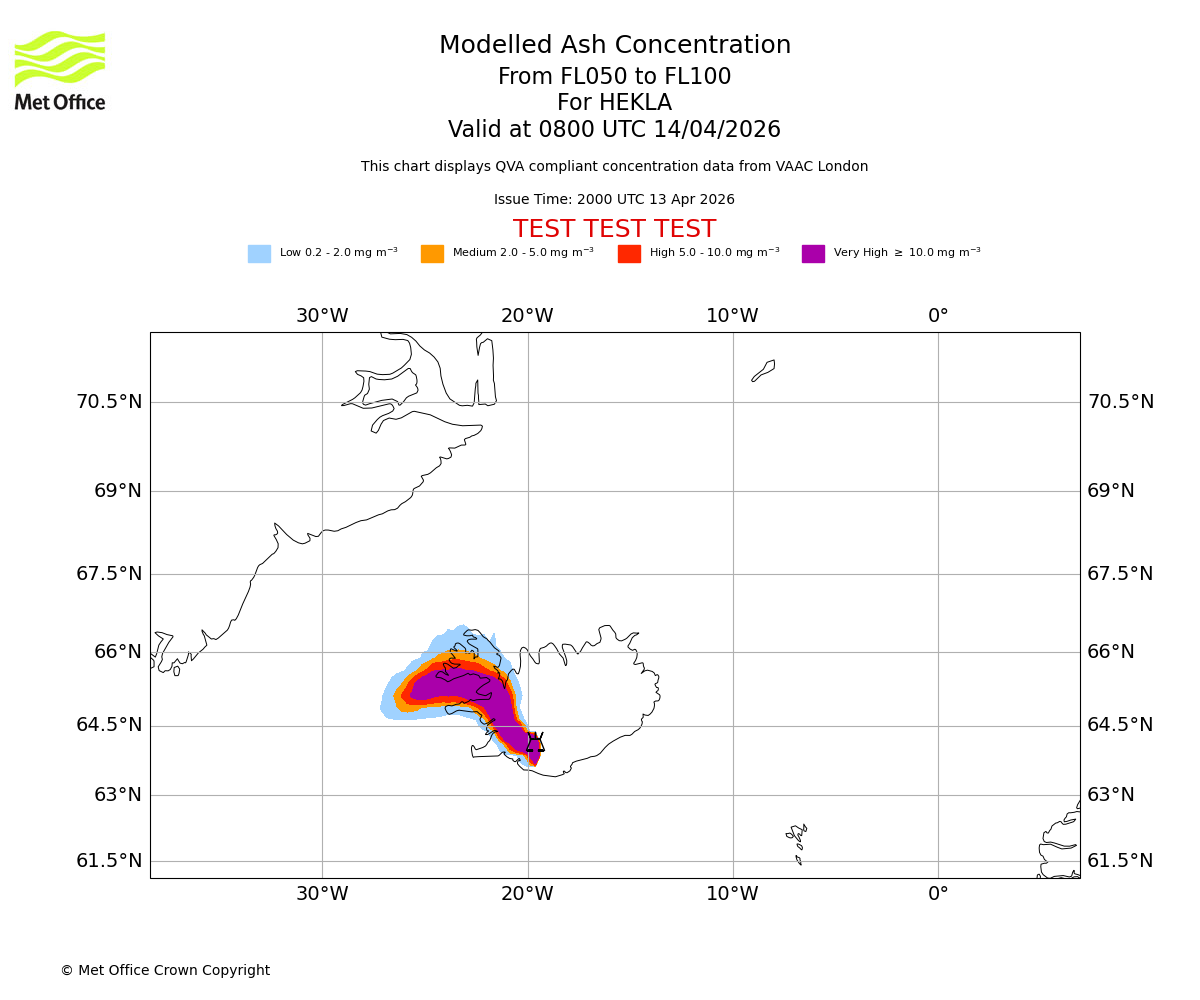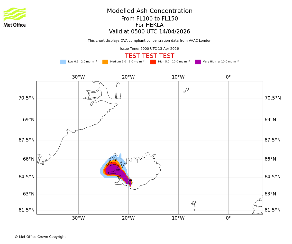 Modelled ash concentration from 050 to 100 for HEKLA. Valid at 0500 UTC 14/04/2026