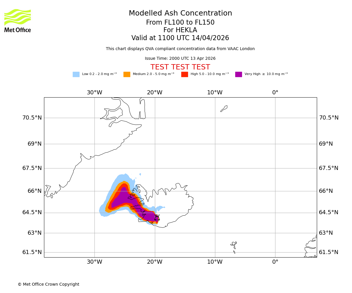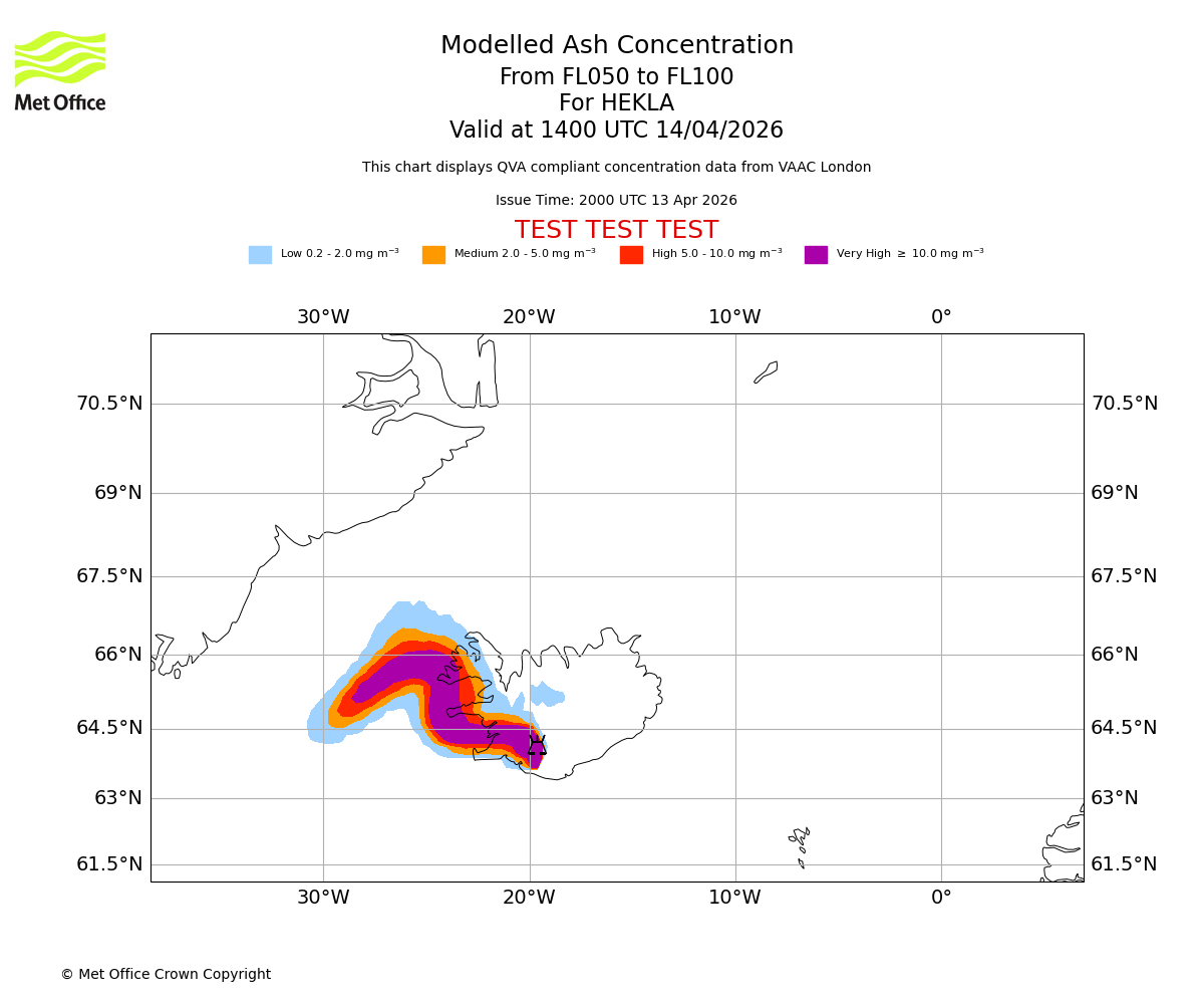 Modelled ash concentration from 050 to 100 for HEKLA. Valid at 1100 UTC 14/04/2026