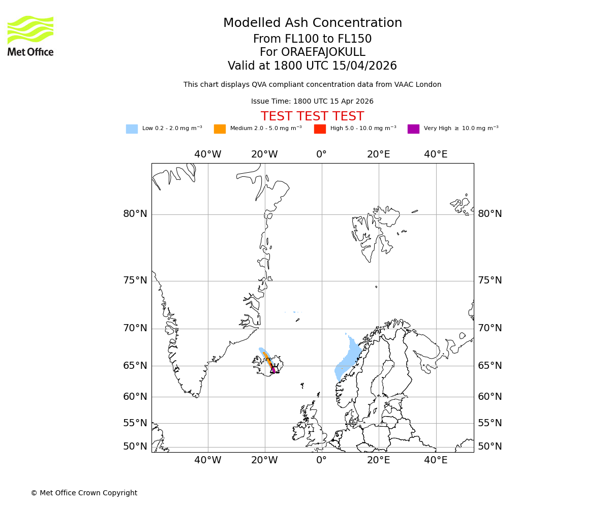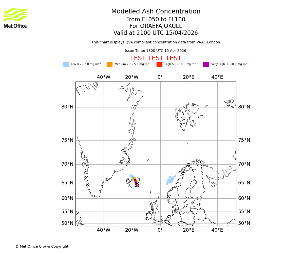 Modelled ash concentration from 050 to 100 for ORAEFAJOKULL. Valid at 1800 UTC 15/04/2026