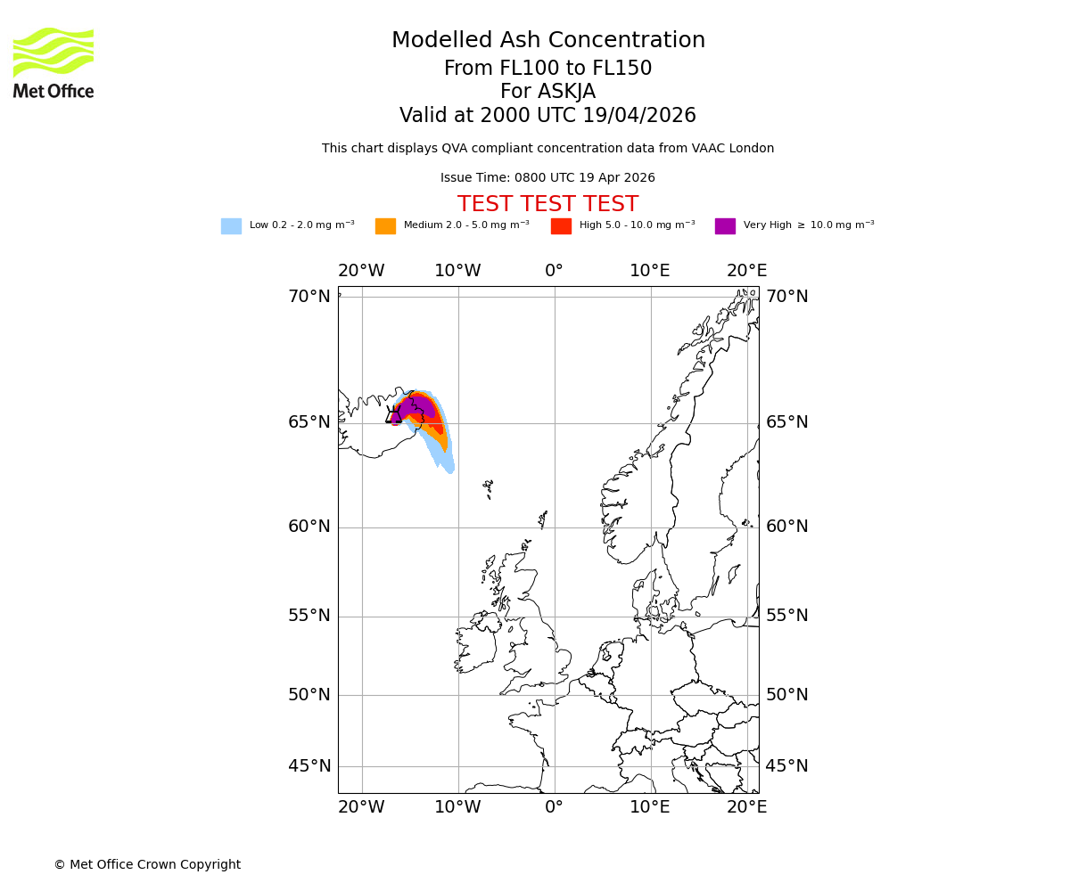 Modelled ash concentration from 050 to 100 for ASKJA. Valid at 2000 UTC 19/04/2026