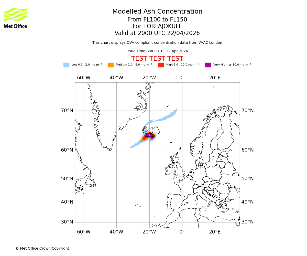 Modelled ash concentration from 050 to 100 for TORFAJOKULL. Valid at 2000 UTC 22/04/2026