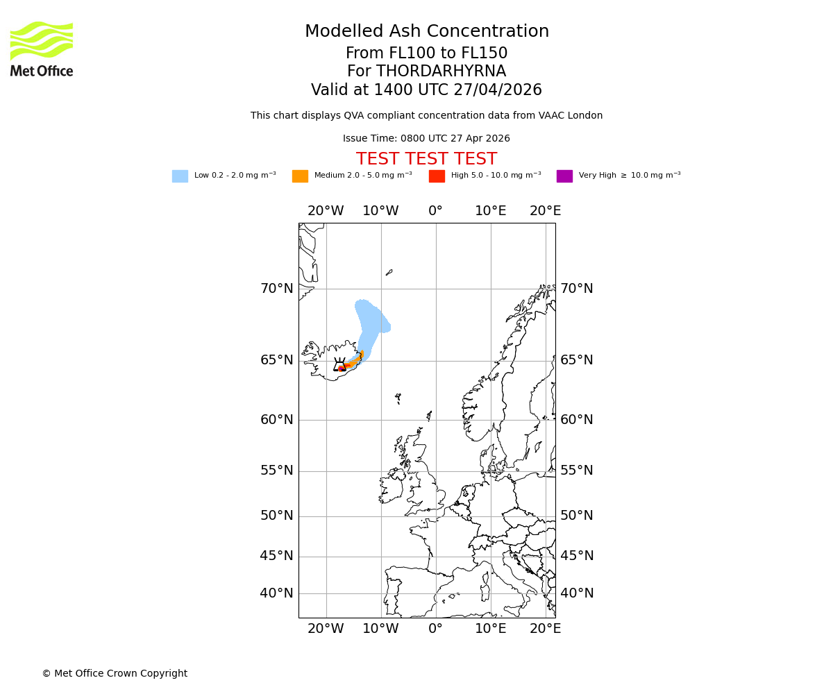 Modelled ash concentration from 050 to 100 for THORDARHYRNA. Valid at 1400 UTC 27/04/2026