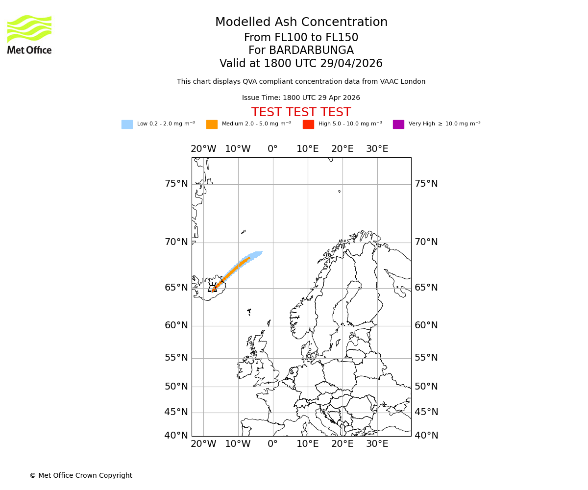 Modelled ash concentration from 050 to 100 for BARDARBUNGA. Valid at 1800 UTC 29/04/2026