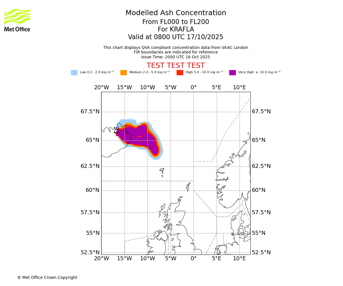 Modelled ash concentration from 050 to 100 for KRAFLA. Valid at 2000 UTC 16/10/2025