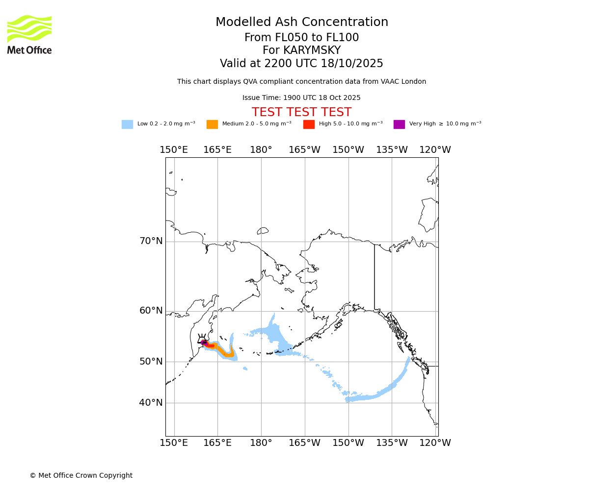 Modelled ash concentration from 050 to 100 for KARYMSKY. Valid at 1900 UTC 18/10/2025