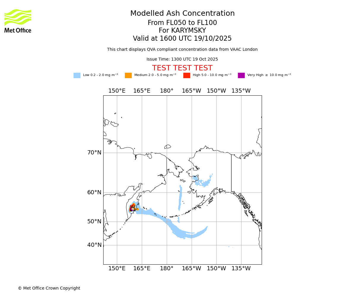 Modelled ash concentration from 050 to 100 for KARYMSKY. Valid at 1300 UTC 19/10/2025