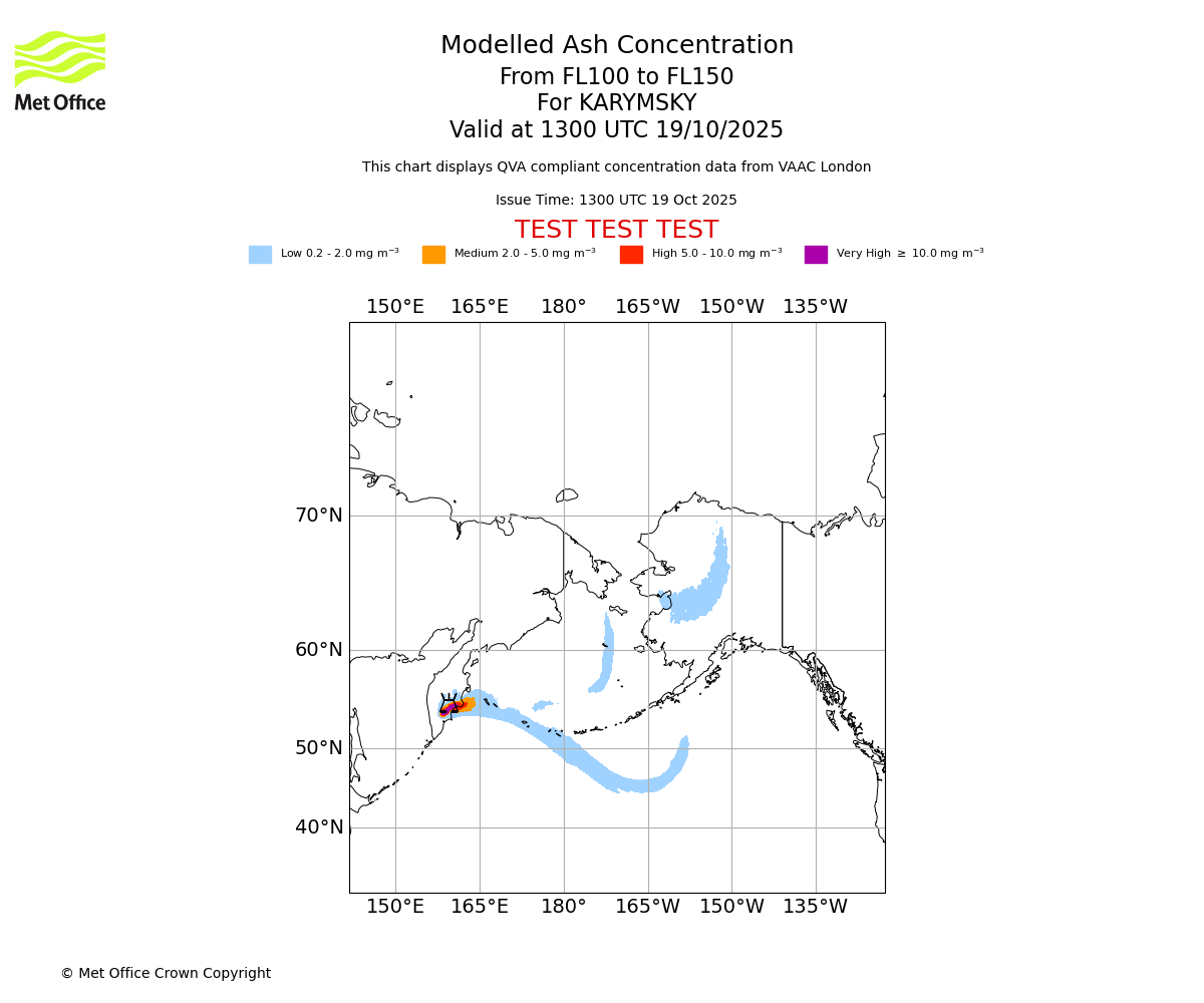 Modelled ash concentration from 000 to 200 for KARYMSKY. Valid at 1300 UTC 19/10/2025
