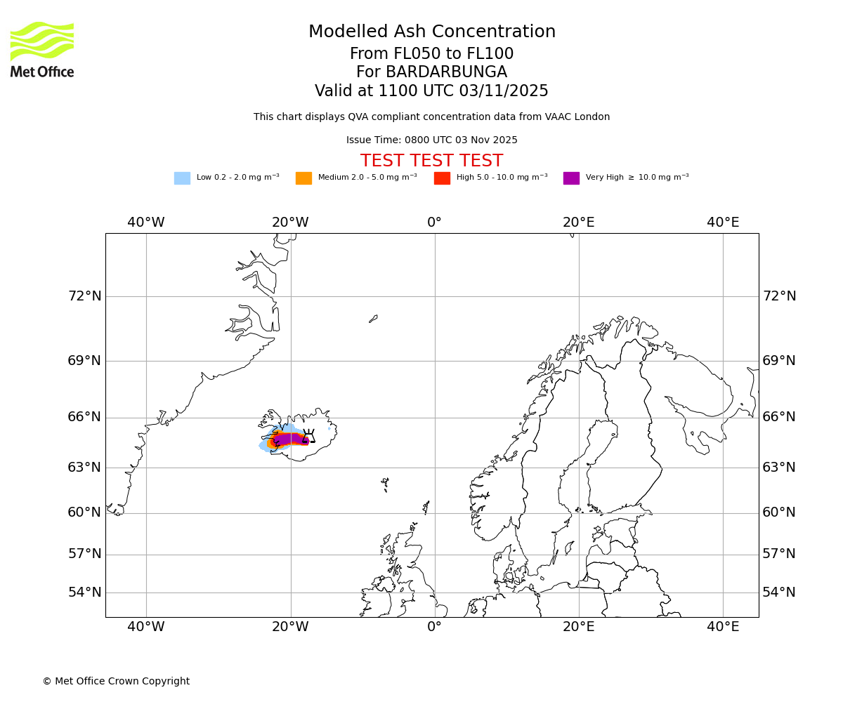 Modelled ash concentration from 050 to 100 for BARDARBUNGA. Valid at 0800 UTC 03/11/2025