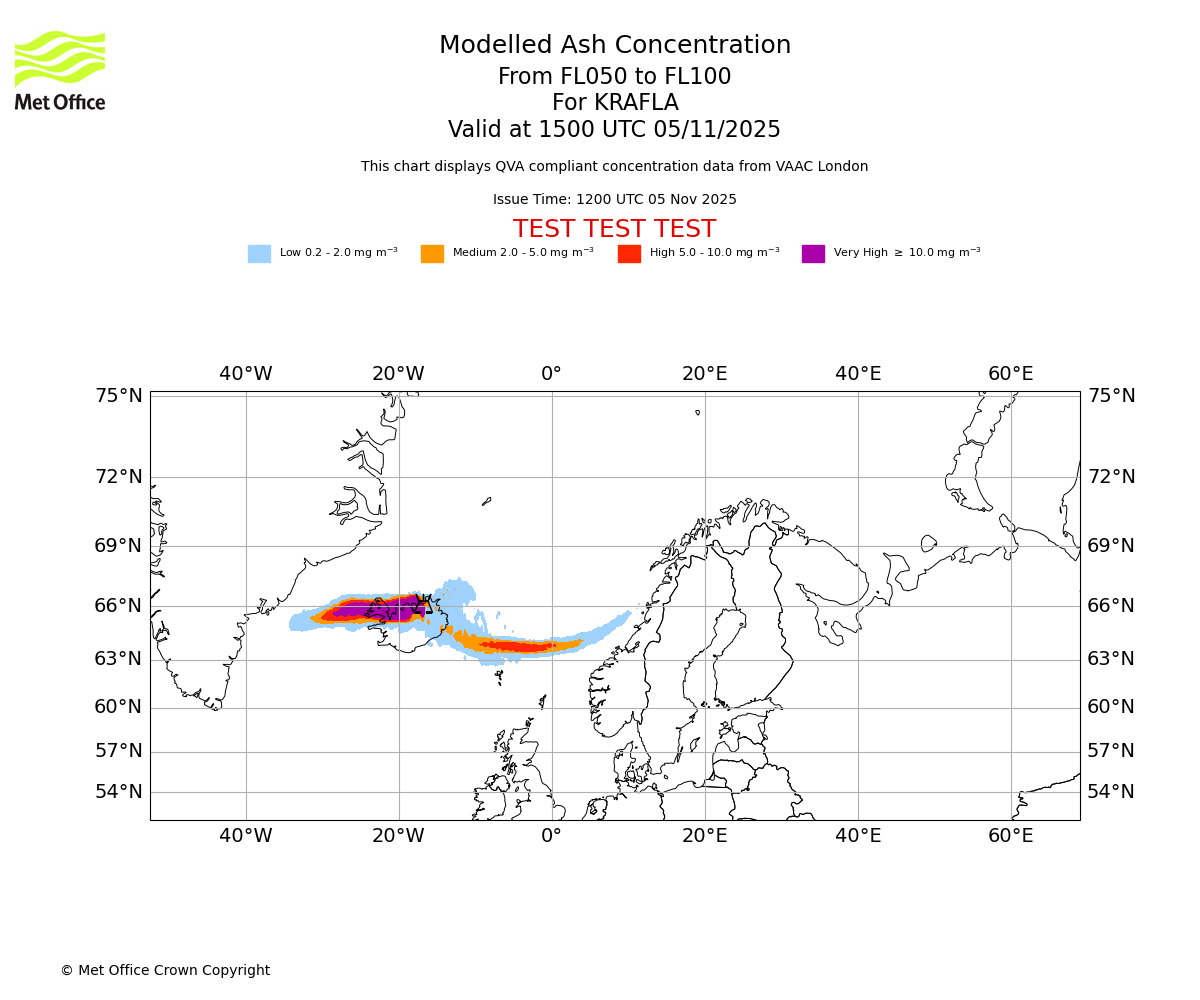 Modelled ash concentration from 050 to 100 for KRAFLA. Valid at 1200 UTC 05/11/2025