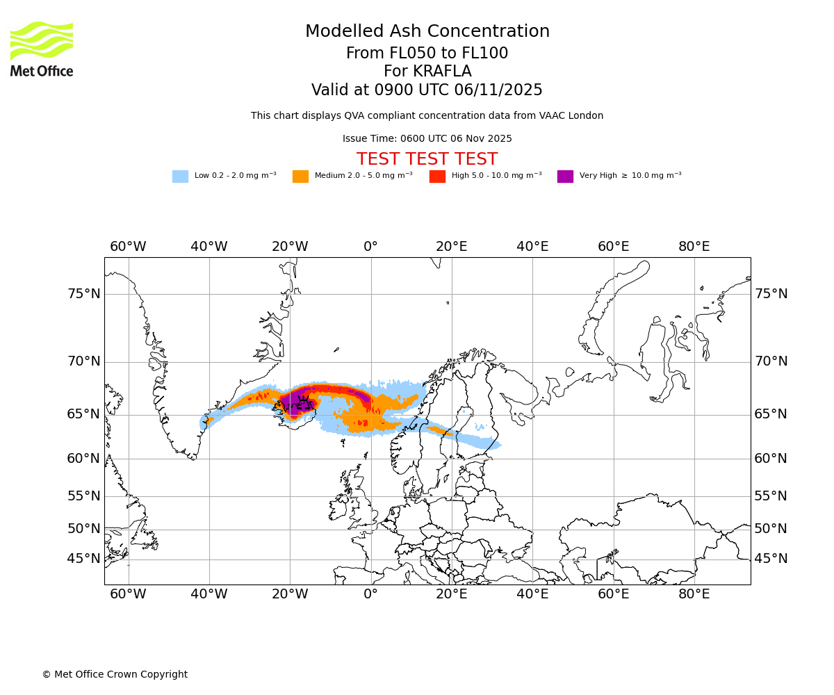 In accordance with ICAO Annex 3, Amendment 82 VAAC London will provide operational QVA forecasts from 27 November 2025 and these will be made available via a VAAC London QVA API information service. These charts are currently provided for test and evaluation purposes (not for operational use) until the introduction of the operational service.