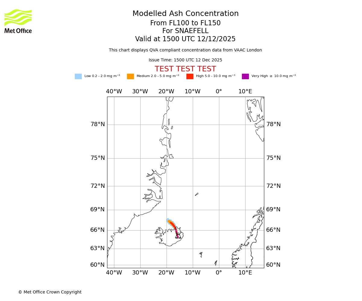 Modelled ash concentration from 050 to 100 for SNAEFELL. Valid at 1500 UTC 12/12/2025