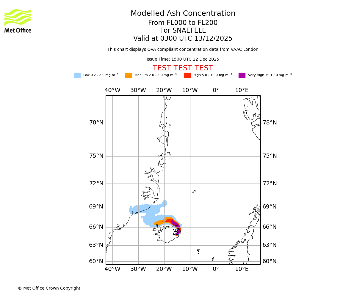Modelled ash concentration from 050 to 100 for SNAEFELL. Valid at 1500 UTC 12/12/2025