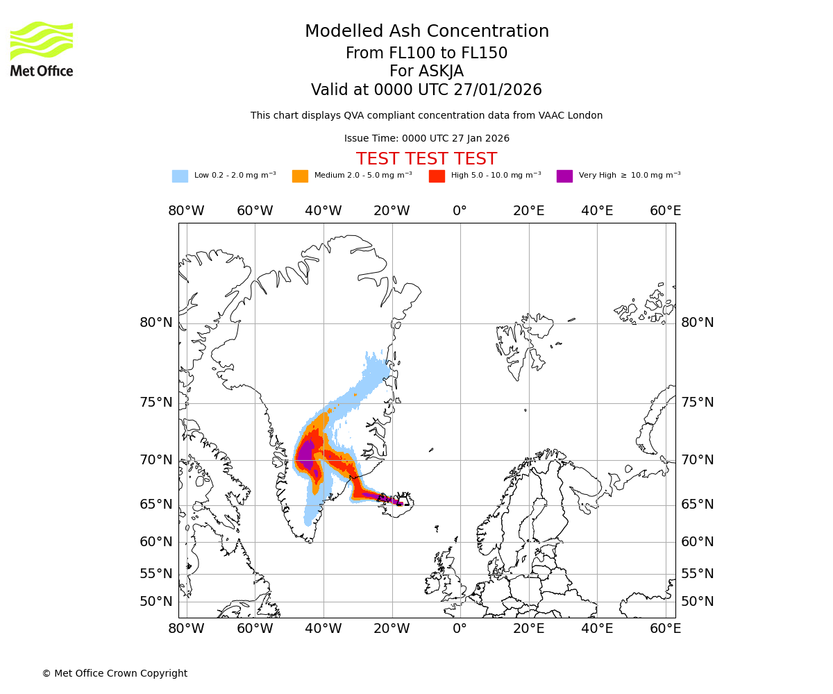 Modelled ash concentration from 050 to 100 for ASKJA. Valid at 0000 UTC 27/01/2026