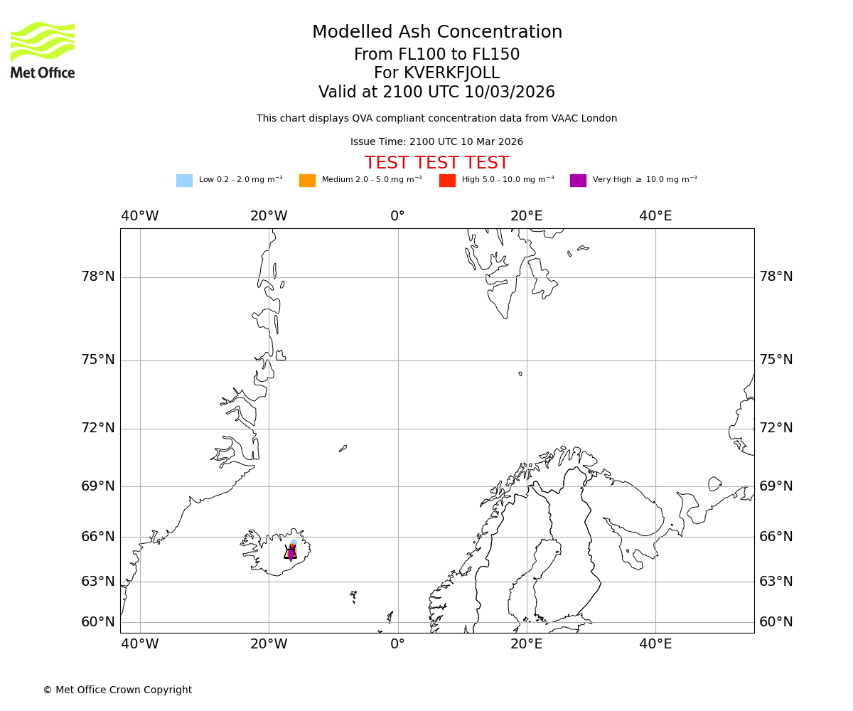 Modelled ash concentration from 050 to 100 for KVERKFJOLL. Valid at 2100 UTC 10/03/2026