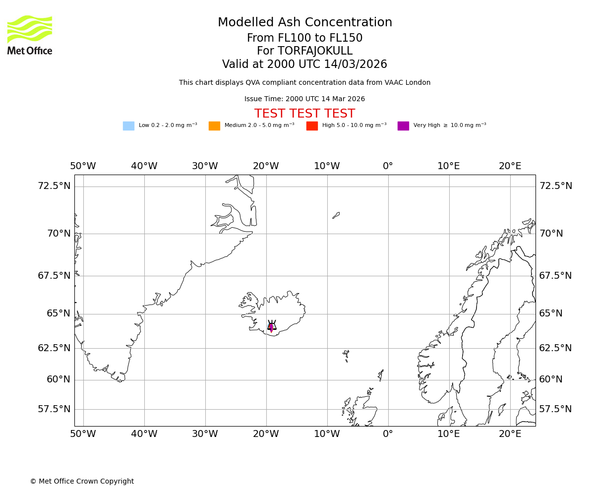Modelled ash concentration from 050 to 100 for TORFAJOKULL. Valid at 2000 UTC 14/03/2026