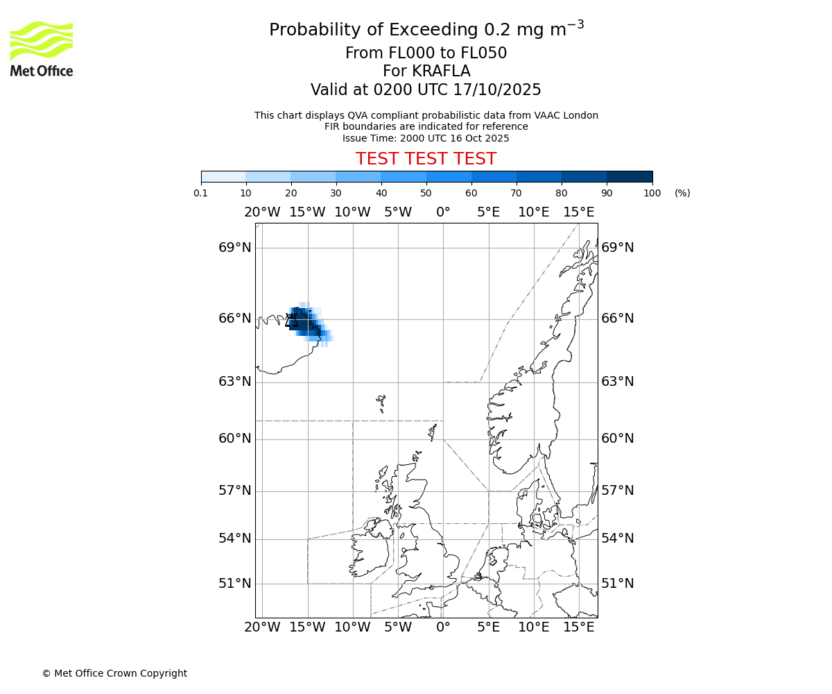 Probability of exceeding 0.2 milligrams per metre cubed. From 000 to 050 for KRAFLA. Valid at 2300 UTC 16/10/2025