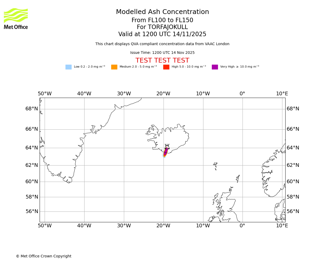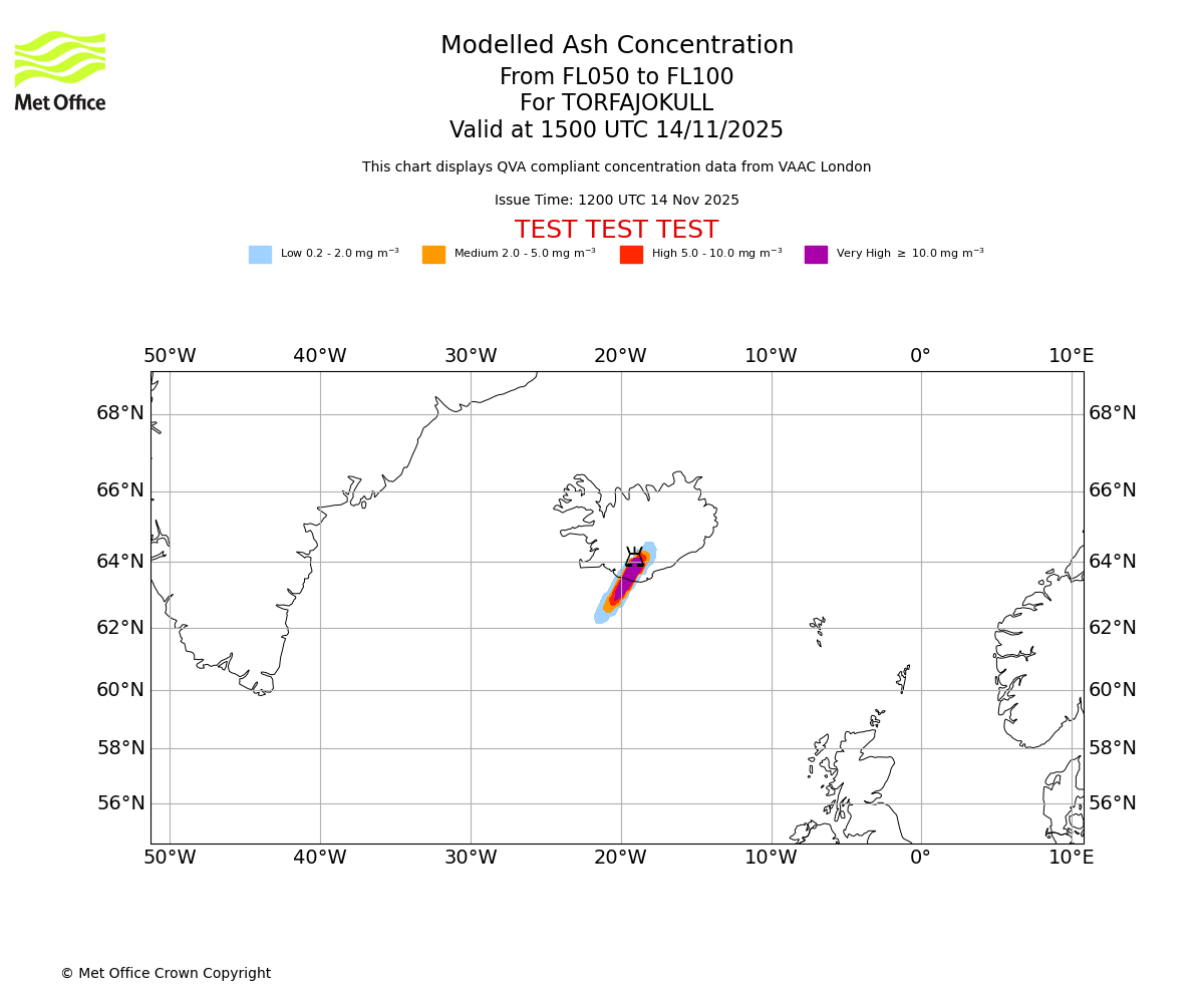 Modelled ash concentration from 050 to 100 for TORFAJOKULL. Valid at 1200 UTC 14/11/2025