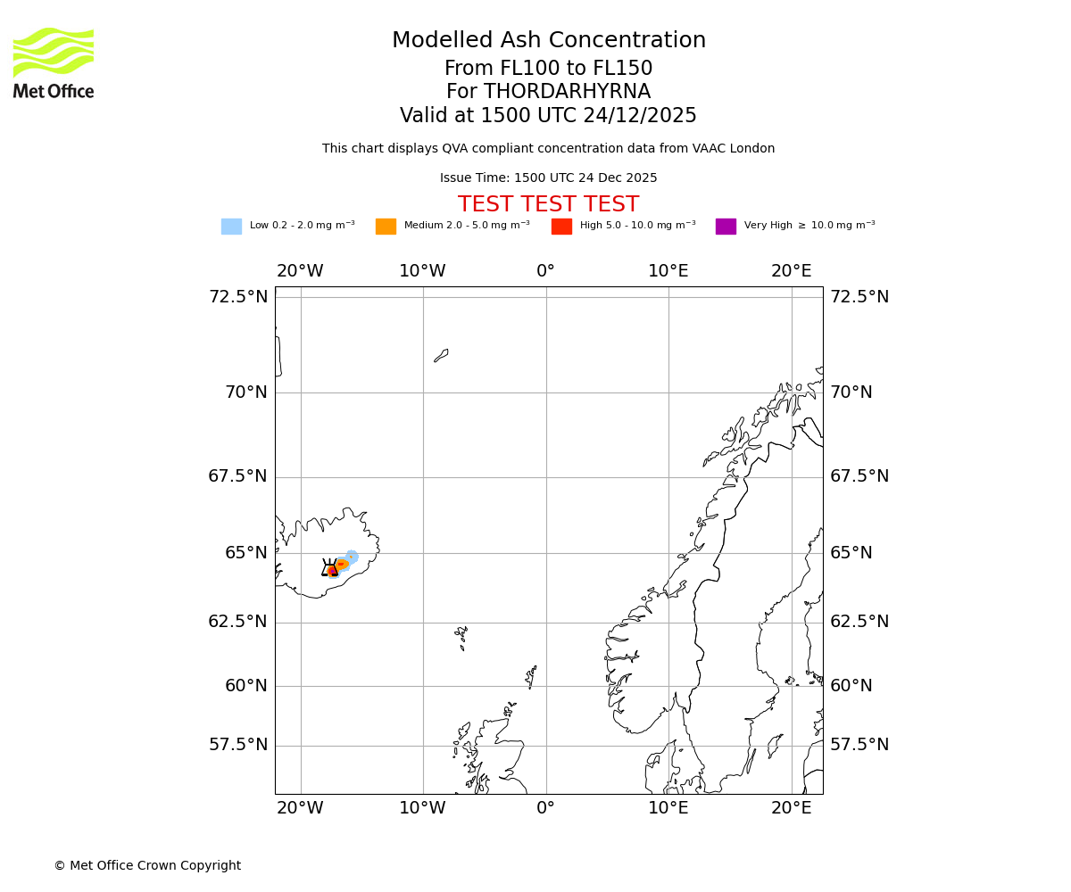 Modelled ash concentration from 050 to 100 for THORDARHYRNA. Valid at 1500 UTC 24/12/2025