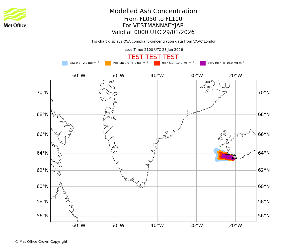 Modelled ash concentration from 050 to 100 for VESTMANNAEYJAR. Valid at 2100 UTC 28/01/2026