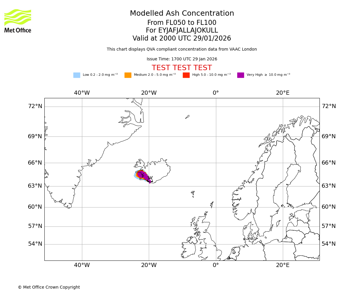 Modelled ash concentration from 050 to 100 for EYJAFJALLAJOKULL. Valid at 1700 UTC 29/01/2026