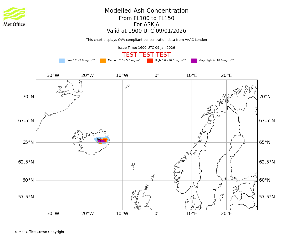 Modelled ash concentration from 100 to 150 for ASKJA. Valid at 1600 UTC 09/01/2026