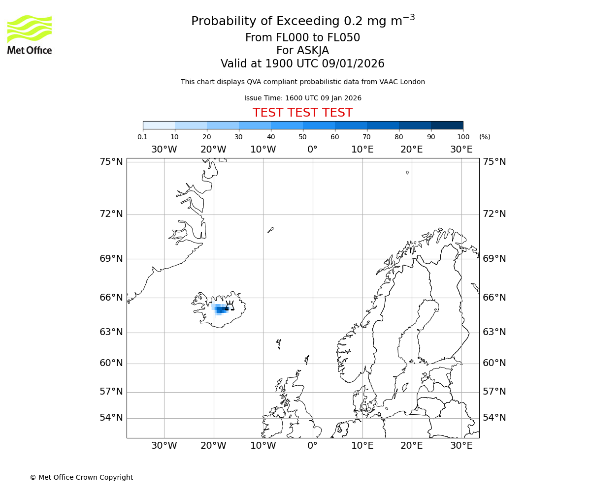 Probability of exceeding 0.2 milligrams per metre cubed. From 000 to 050 for ASKJA. Valid at 1600 UTC 09/01/2026
