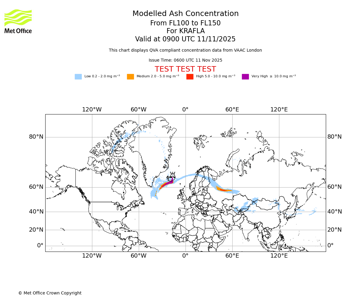 In accordance with ICAO Annex 3, Amendment 82 VAAC London will provide operational QVA forecasts from 27 November 2025 and these will be made available via a VAAC London QVA API information service. These charts are currently provided for test and evaluation purposes (not for operational use) until the introduction of the operational service.