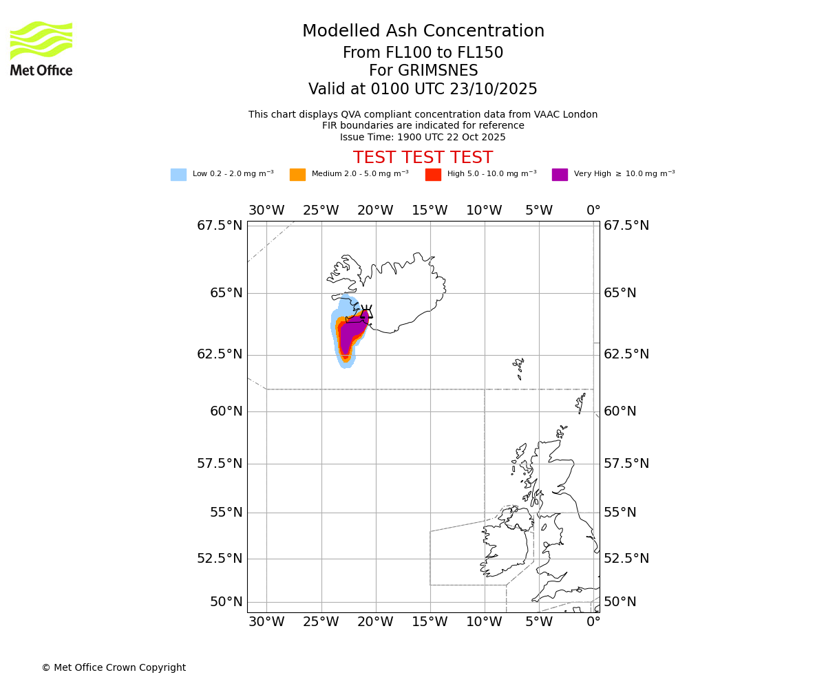 Modelled ash concentration from 100 to 150 for GRIMSNES. Valid at 2200 UTC 22/10/2025