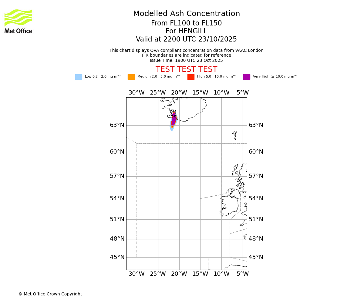 Modelled ash concentration from 100 to 150 for HENGILL. Valid at 1900 UTC 23/10/2025