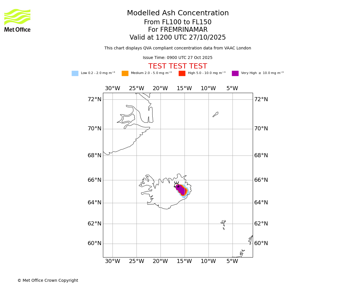 Modelled ash concentration from 100 to 150 for FREMRINAMAR. Valid at 0900 UTC 27/10/2025