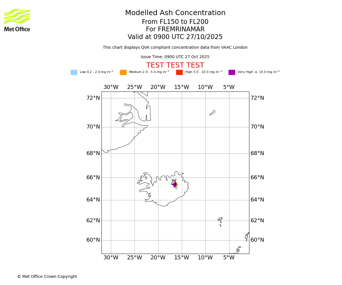 Modelled ash concentration from 000 to 200 for FREMRINAMAR. Valid at 0900 UTC 27/10/2025