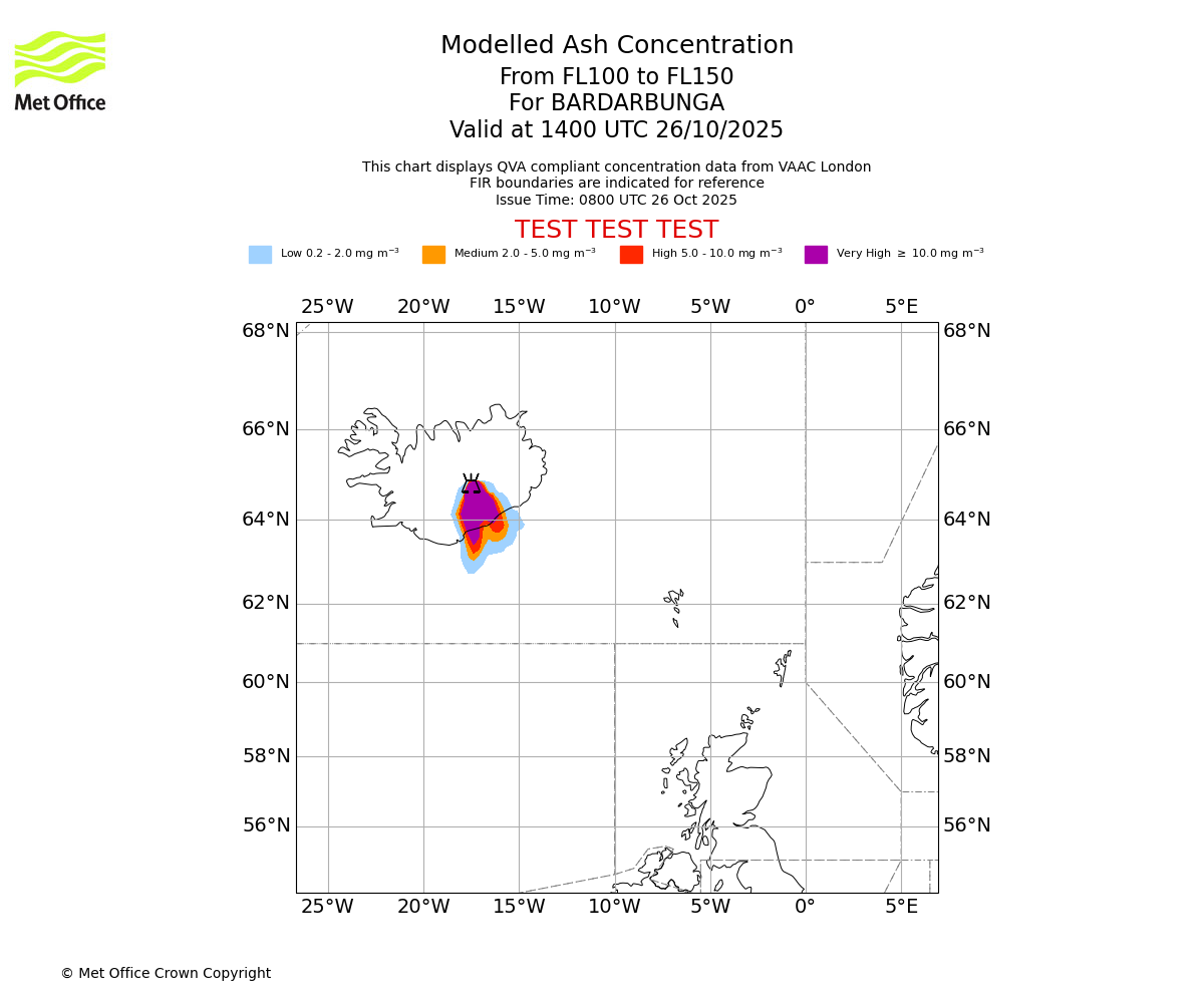 Modelled ash concentration from 100 to 150 for BARDARBUNGA. Valid at 1100 UTC 26/10/2025