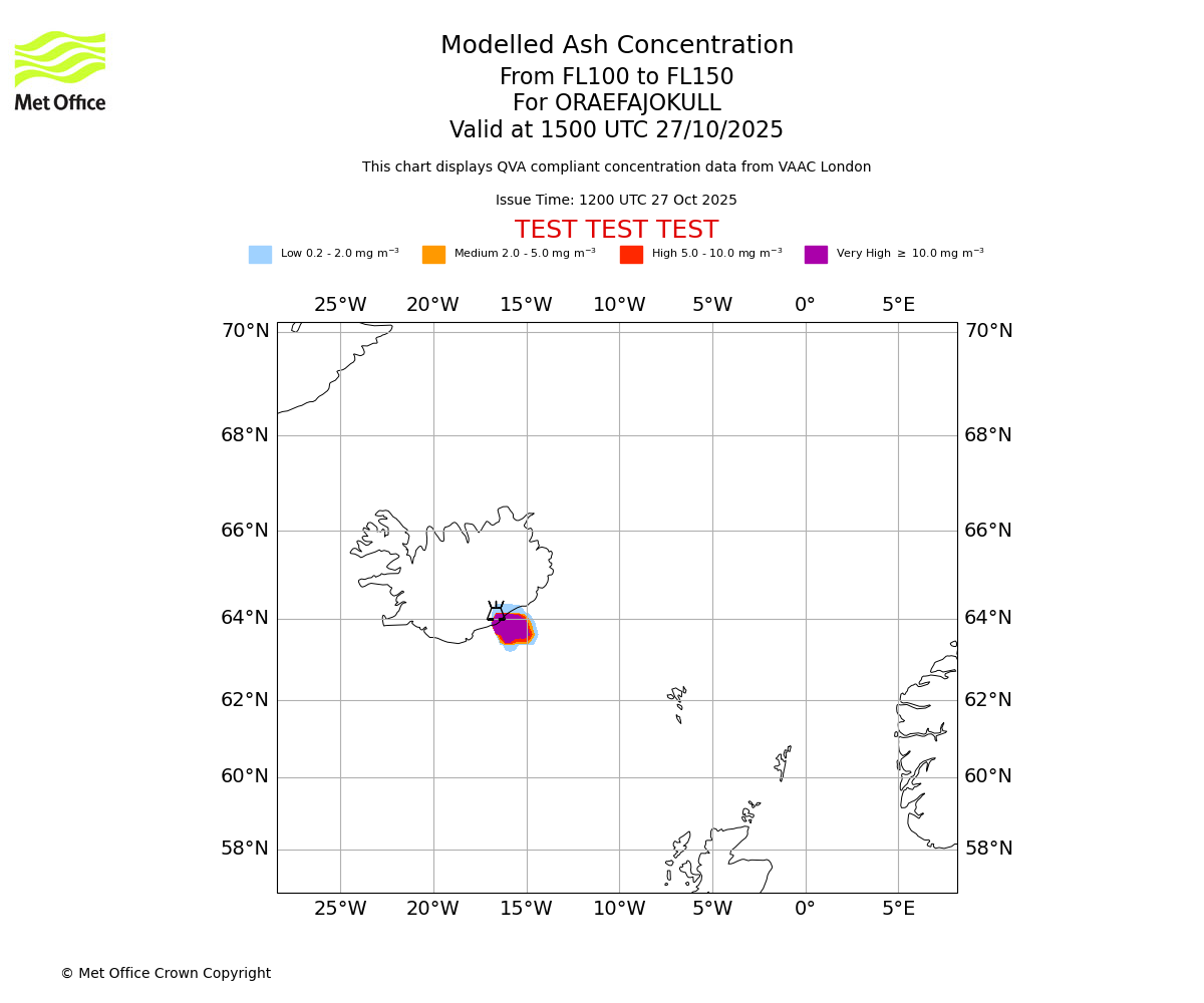 Modelled ash concentration from 100 to 150 for ORAEFAJOKULL. Valid at 1200 UTC 27/10/2025