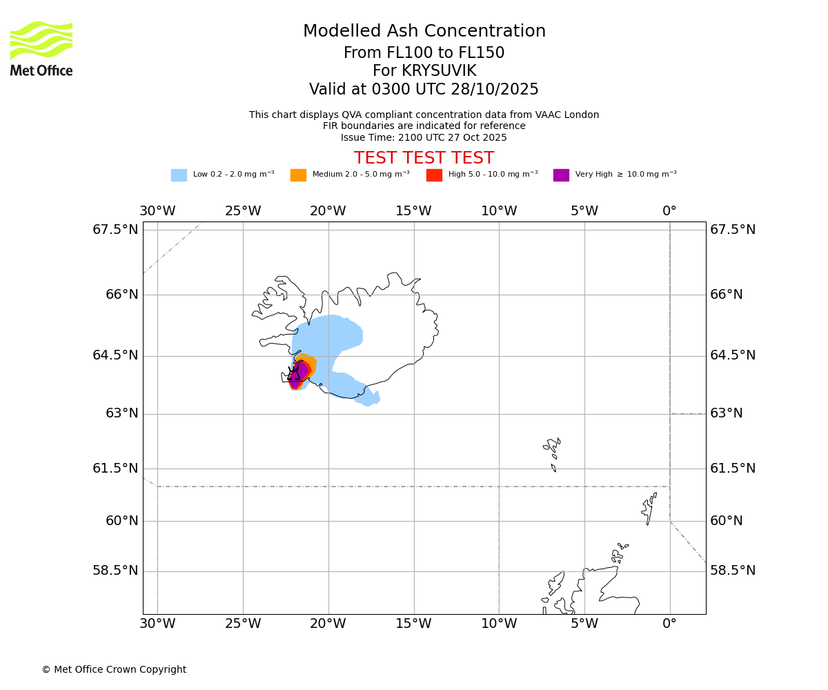 Modelled ash concentration from 100 to 150 for KRYSUVIK. Valid at 0000 UTC 28/10/2025