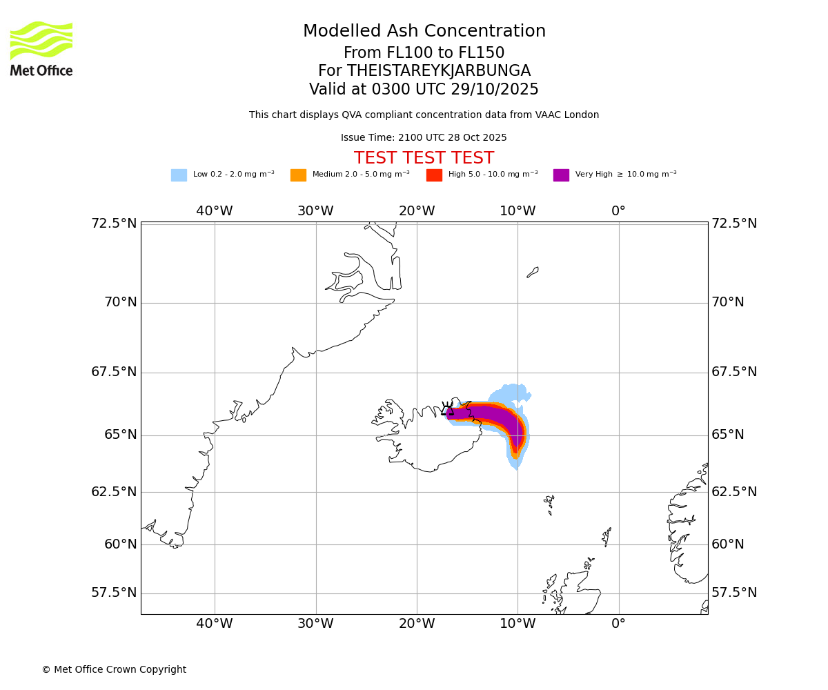Modelled ash concentration from 100 to 150 for THEISTAREYKJARBUNGA. Valid at 0000 UTC 29/10/2025