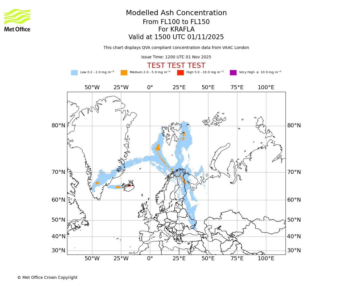 Modelled ash concentration from 100 to 150 for KRAFLA. Valid at 1200 UTC 01/11/2025
