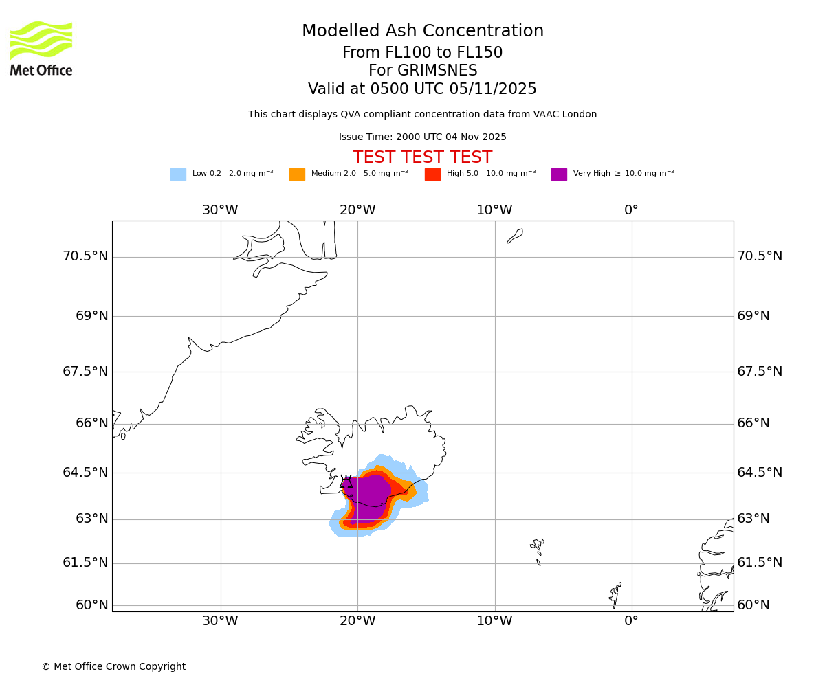 In accordance with ICAO Annex 3, Amendment 82 VAAC London will provide operational QVA forecasts from 27 November 2025 and these will be made available via a VAAC London QVA API information service. These charts are currently provided for test and evaluation purposes (not for operational use) until the introduction of the operational service.
