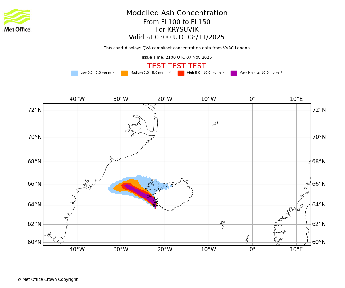 Modelled ash concentration from 100 to 150 for KRYSUVIK. Valid at 0000 UTC 08/11/2025