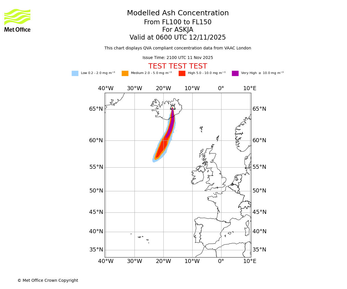 In accordance with ICAO Annex 3, Amendment 82 VAAC London will provide operational QVA forecasts from 27 November 2025 and these will be made available via a VAAC London QVA API information service. These charts are currently provided for test and evaluation purposes (not for operational use) until the introduction of the operational service.
