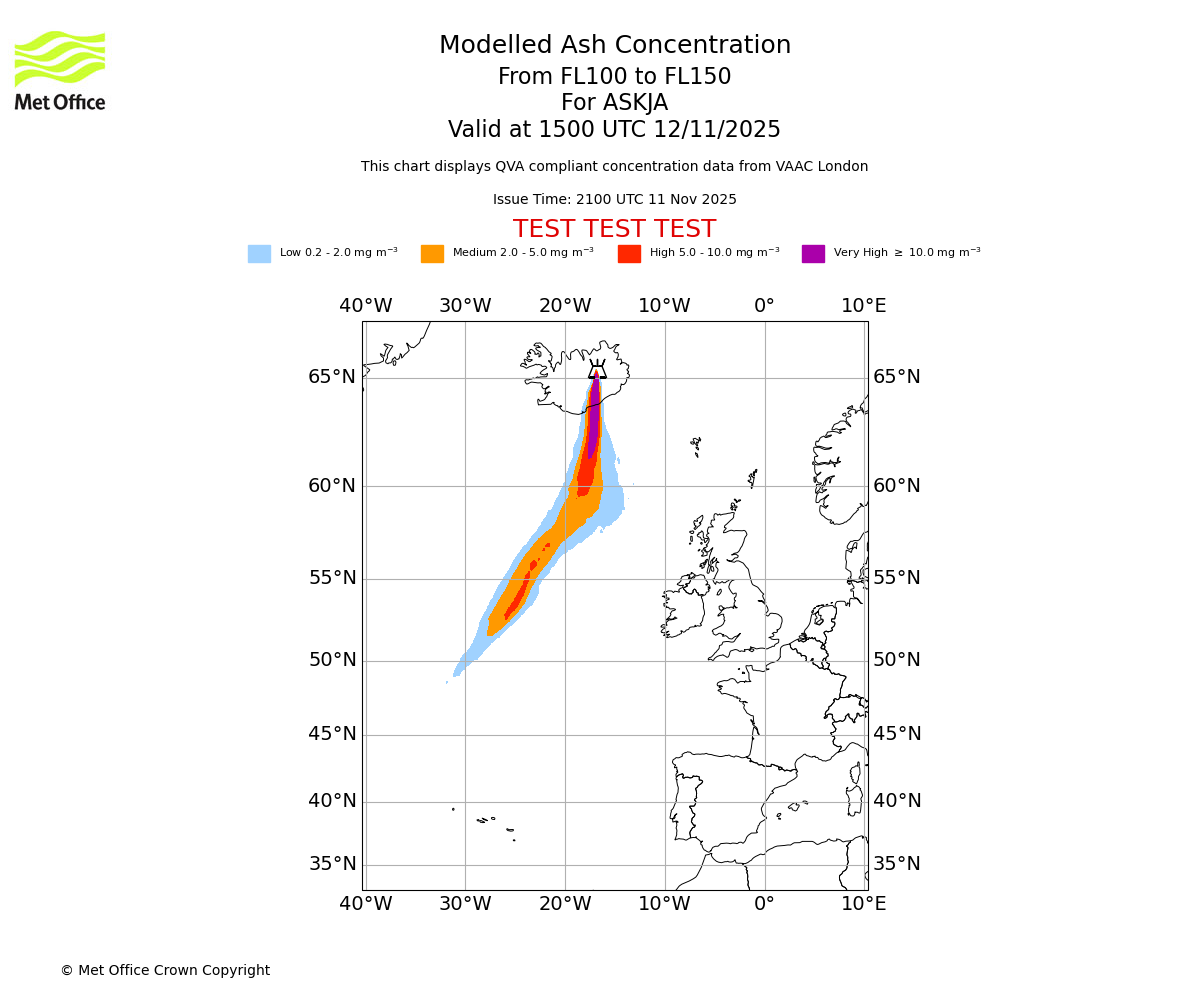 Modelled ash concentration from 100 to 150 for ASKJA. Valid at 1200 UTC 12/11/2025