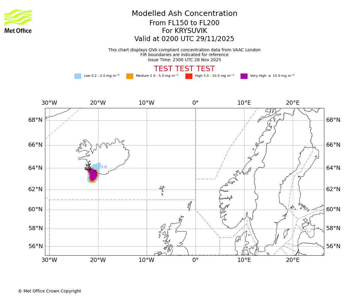 Modelled ash concentration from 100 to 150 for KRYSUVIK. Valid at 0200 UTC 29/11/2025