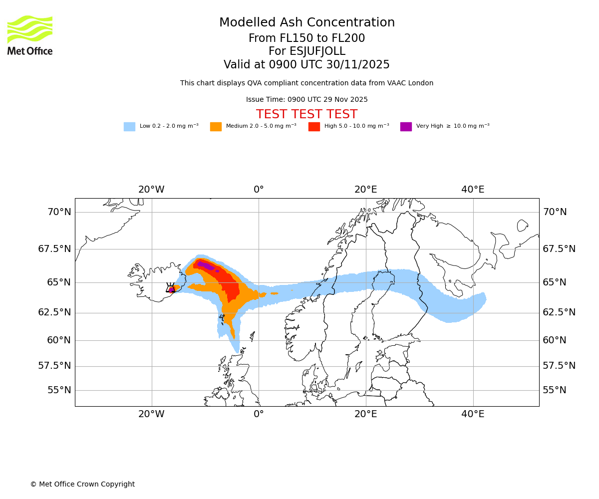 Modelled ash concentration from 100 to 150 for ESJUFJOLL. Valid at 0900 UTC 30/11/2025