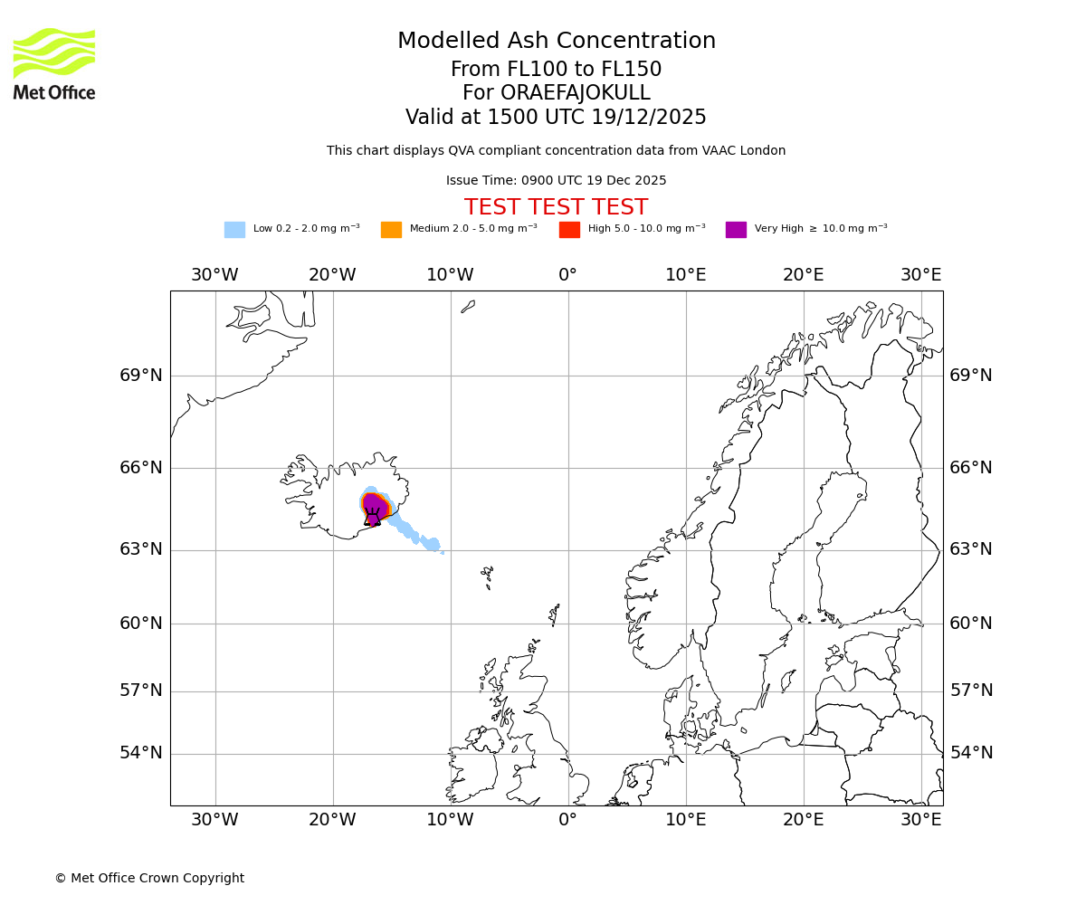 Modelled ash concentration from 100 to 150 for ORAEFAJOKULL. Valid at 1200 UTC 19/12/2025